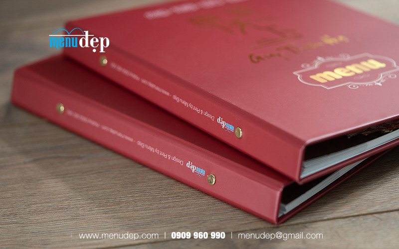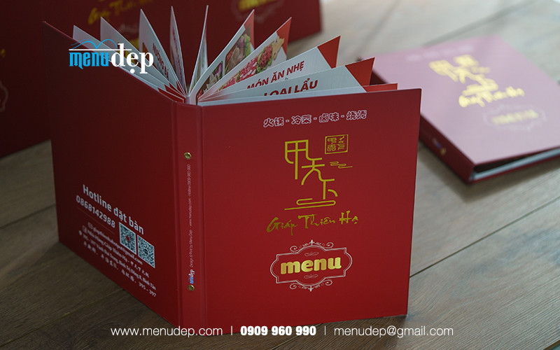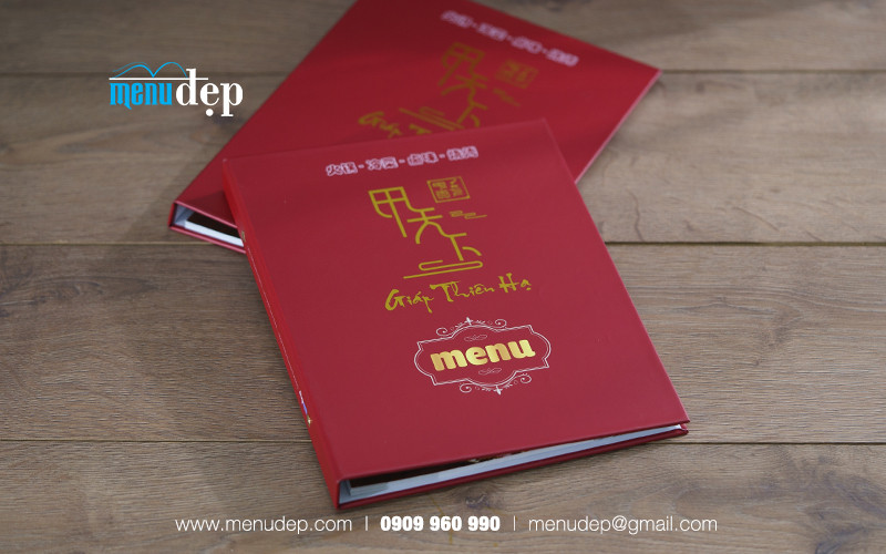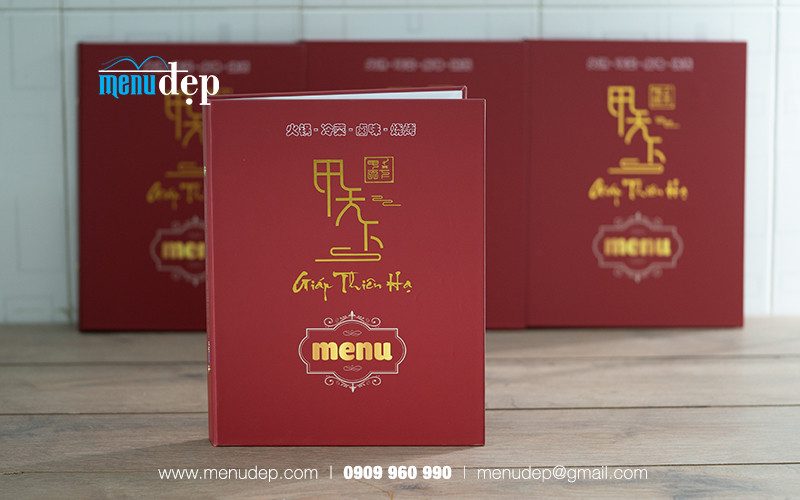 Giáp Thiên Hạ là menu chuyên món Hoa nên phong cách thiết kế menu mang đặc trưng Hoa như tone đỏ chữ vàng. Để làm nổi bậc hơn cho trang bìa, Menu Đẹp đã tư vấn nhà hàng ép nhũ vàng cho logo ở bìa. Việc tăng thêm chi phí do độ phức tạp, tinh vi khi ép nhũ so với in mực thông thường là không đáng kể với hiệu quả đạt được với kiểu ép nhũ. Ánh nhũ vàng lắp lánh tạo sự lung linh cho bìa và rất phù hợp với phong cách người Hoa.